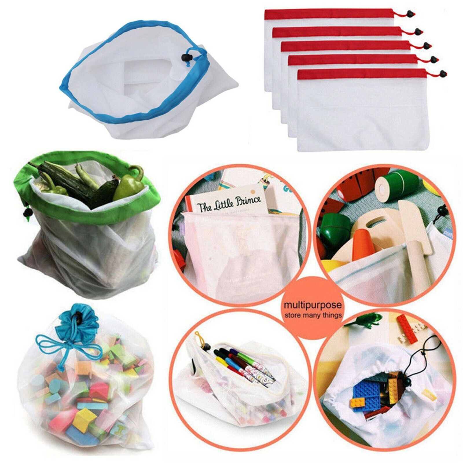12pcs Reusable Mesh Bags Rope Vegetable Toys Storage Pouch Fruit & Grocery Bags