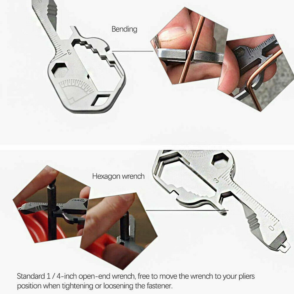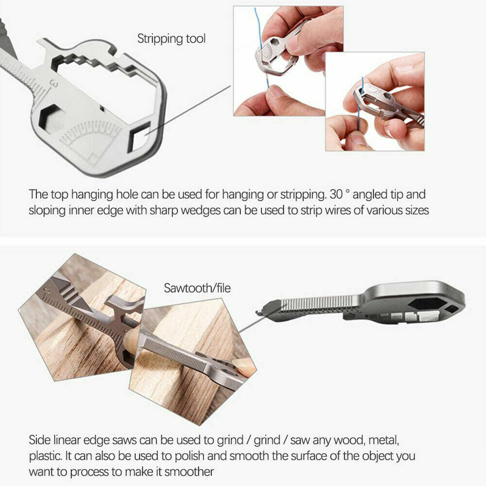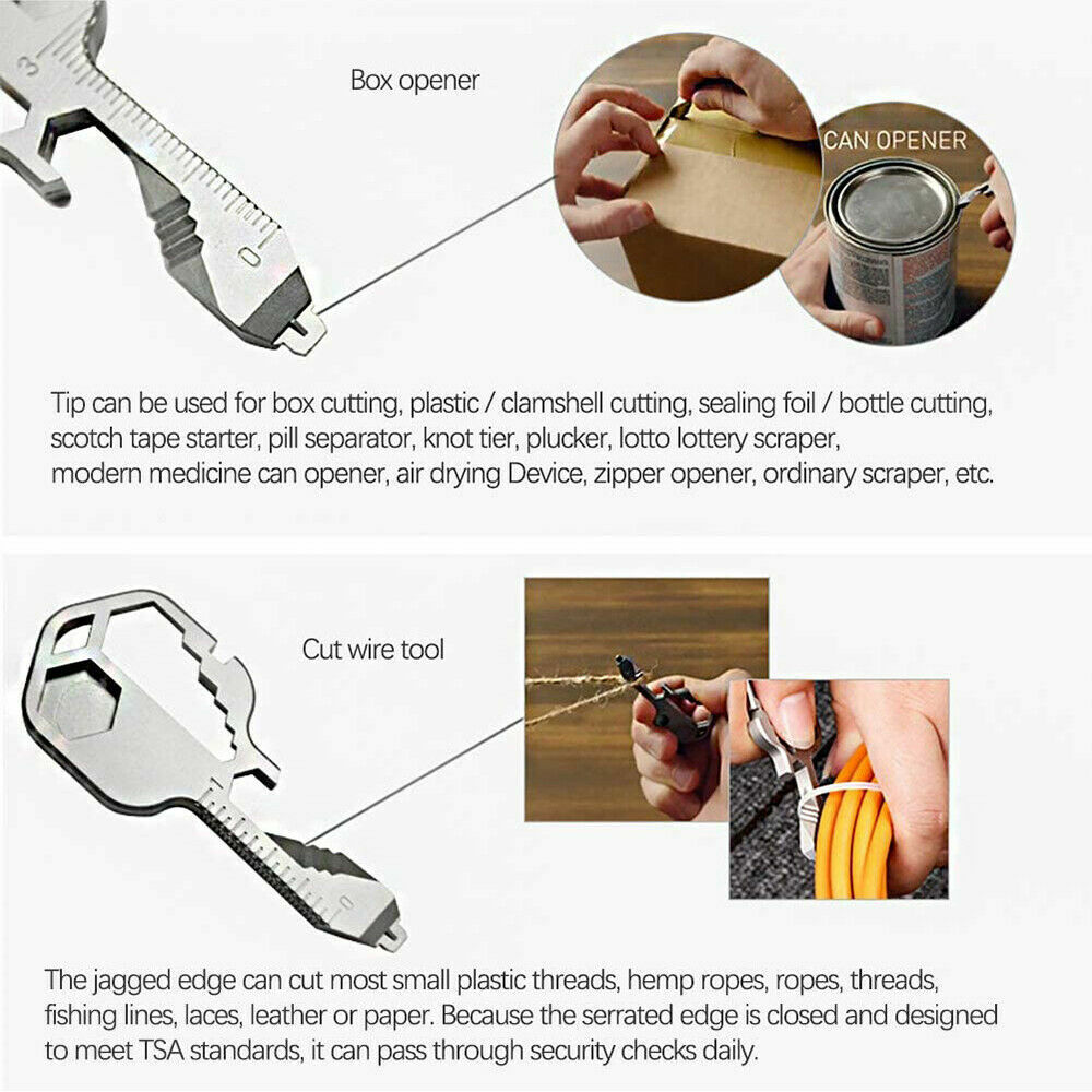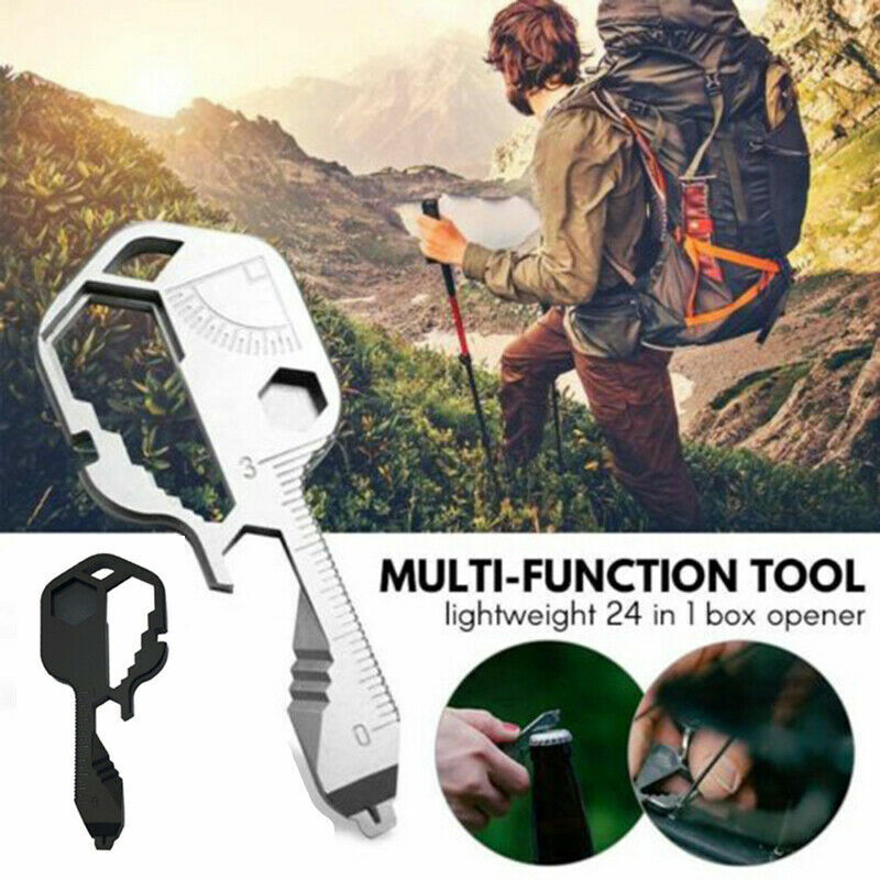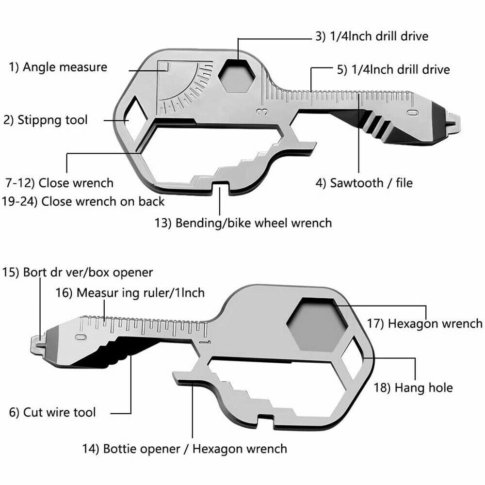 24in1: Screwdriver, Hex Bit Driver, Bottle Opener, Drill Drive, Cut Wire Tool, Angle Measure, Box Opener, Stripping, Close Wrench, Ruler.
