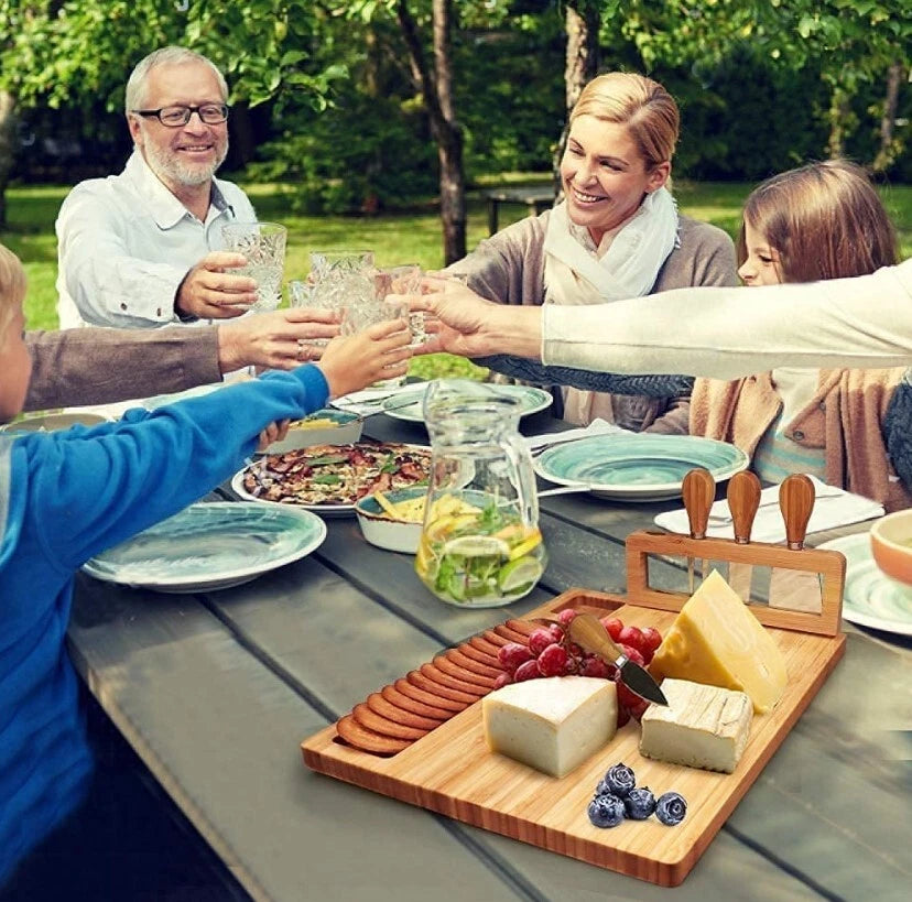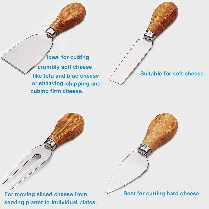 - CONVENIENTLY SLEEK: A sophisticated-designed cheese board tray with serving utensils knife set: these trays feature stainless steel blades and easy-grip bamboo handles to dazzle your guests with a sumptuous sharing platter.