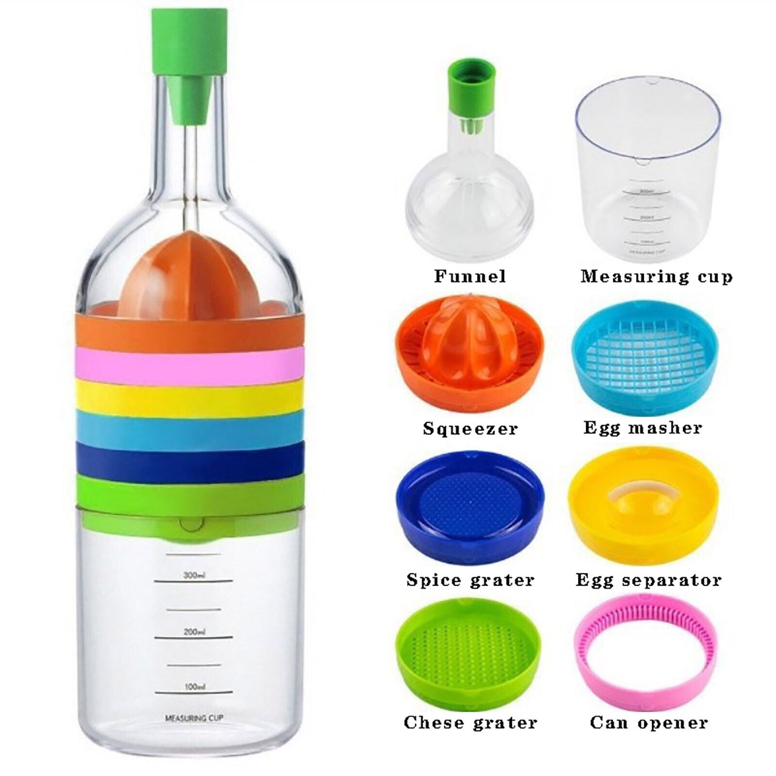 Widely used;Comes with a funnel, juicer, grater, eggs cracker, shredder, can opener, eggs separator and measuring cup. No need to purchase your kitchen tools separately